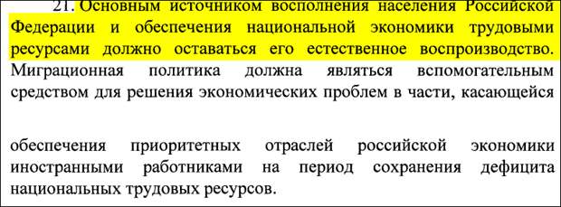 Постулировано, что основным источником восполнения населения нашей страны является естественное воспроизводство. То есть официально признаётся порочной практика, когда отдельные чиновники думали, мол, завезём 200 тысяч среднеазиатов за год — подправим циферки в отчётах, продемонстрируем "рост".