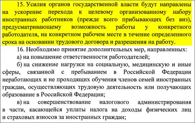 Поставлена задача снизить нагрузку мигрантов на социальную инфраструктуру, в особенности со стороны неработающих и не проходящих обучение членов семей. Прямым текстом сказано, что их присутствие на территории России будет ограниченным.