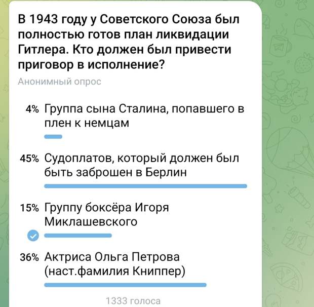 Сразу за самым популярным ответом про Судоплатова, идёт актриса Ольга Петрова (Книппер).35%. И это тоже уловка, чтобы немного запутать 😉😂.