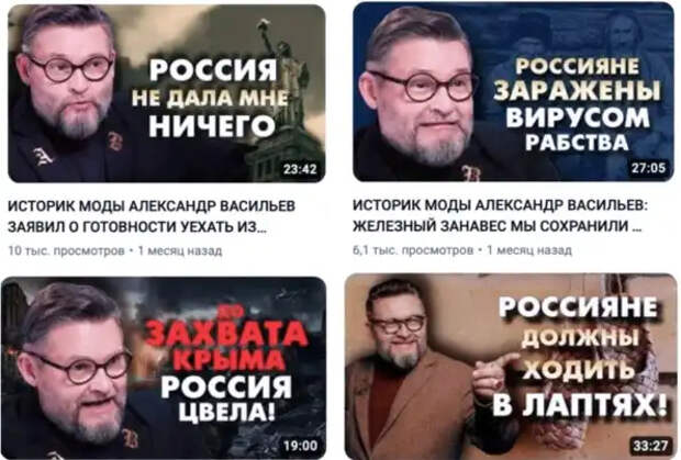 Здравствуй, дорогая Русская Цивилизация. Обычно мы про такое не пишем, но в данном случае, это важно. Это Александр Васильев, называющий себя маэстро и историком моды. Куча изданных книг, сотни выступлений в стенах именитых вузов России, рекламные контракты с ведущими компаниями России, своя авторская передача на Первом, под названием "Модный Приговор" (больше не идёт). А ещё он имеет гражданство Франции и Литвы, куда умотал после 24 февраля, став рьяным "нетвойнистом". Сидя в мягком кресле он направо и налево раздавал интервью.Цитировать его разговорчики не будем. Ниже только несколько выпусков из того, что он напел: