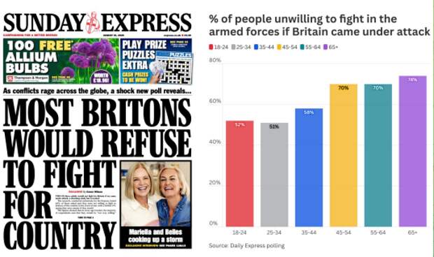 64% совершеннолетних британцев заявили, что они не намерены воевать за Британию, а еще 6% выразили неуверенность по этому поводу. Причем заметьте, во ВСЕХ возрастных категориях жителей Британии абсолютное большинство не намерено оборонять свою страну. Даже среди молодежи доля не желающих воевать превышает 50%.
