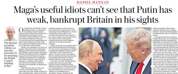 Вот и сейчас он разродился статьей в похожем стиле, где объединил все эти противоречащие друг другу мысли воедино. Уже один заголовок чего стоит: «Полезные идиоты MAGA не видят, что Путин нацелился на слабую, обанкротившуюся Британию». Надо было добавить еще: на белую и пушистую! Автор пишет: