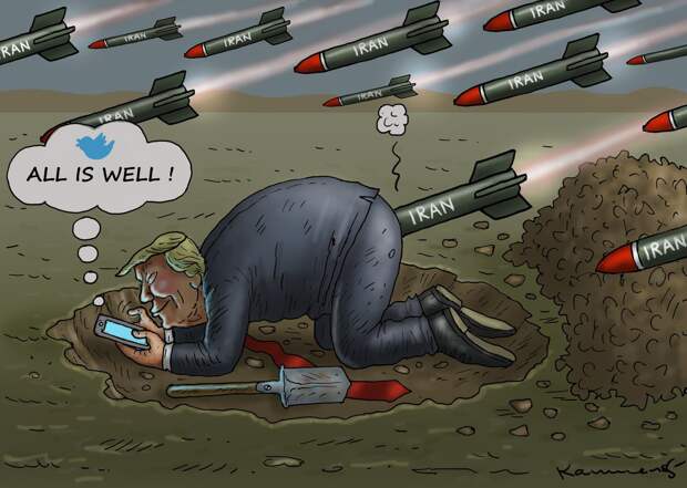Шерхан предпочел ретироваться, поджав хвост. А если без аллегорий, то Трамп выступил перед нацией лишь через полдня и заверил перепуганных американцев,а заодно и остальных встревоженных жителей планеты, что атака обошлась без жертв, призвал иранское руководство решать конфликт мирным путем и пообещал, что пока он будет у власти в США, Иран не станет ядерной державой.