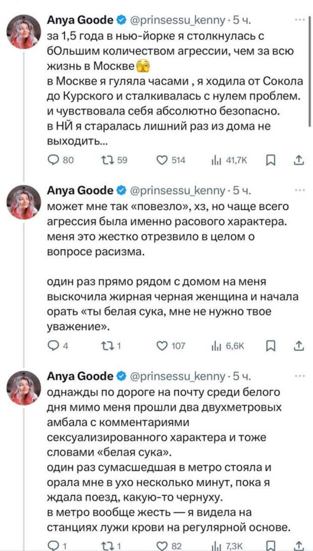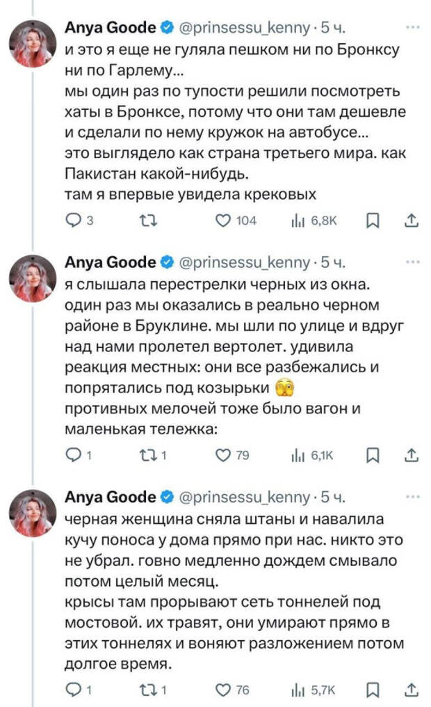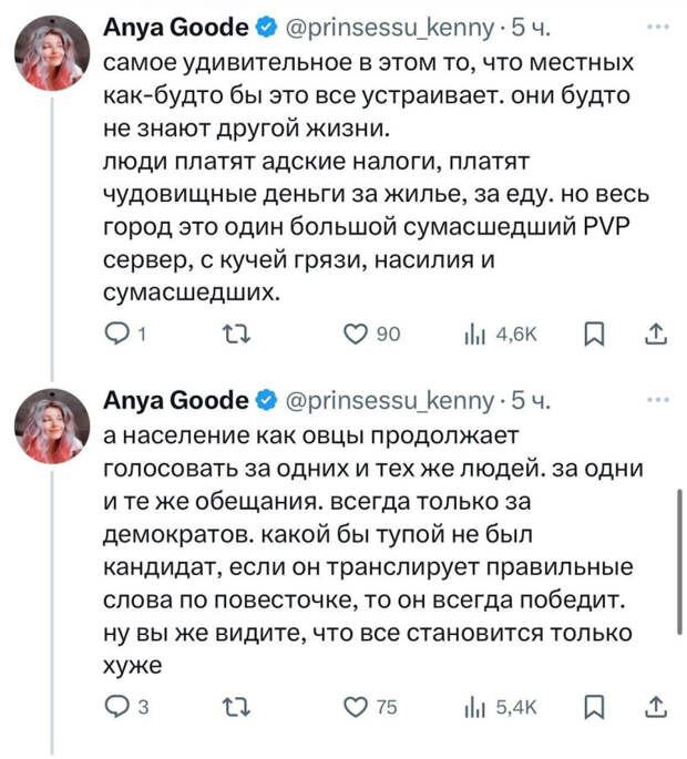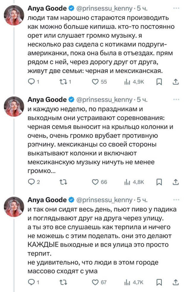 Самое смешное в этой ситуации, это то что она боролась за то что бы здесь было так же! Но свалив туда и увидев какой это пиздец, вот эти её сбывшиеся мечты, жить она в нём не хочет. Но два этих тезиса существуют в её голове независимо друг от друга, и осознание того что она где то ошибалась так и не наступило, несмотря даже на срущих у неё на пороге женщин.