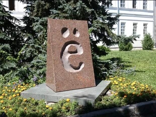 Уникальность "ё" подчёркивает тот факт, что ей даже поставлен памятник. Причём, как утверждают краеведы, это единственный в мире памятник букве алфавита. Установлен он в Ульяновске – родине Карамзина. Идея возникла ещё в 1997 году, а открыт монумент был в 2005-м.