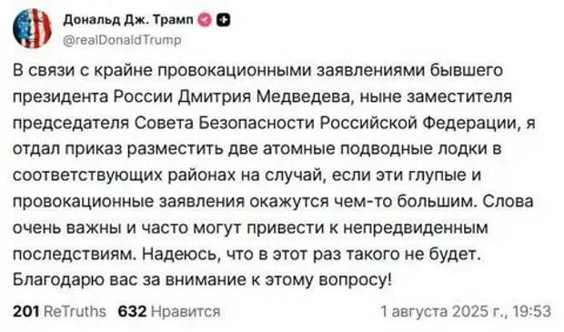 А Трампу надо спокойнее реагировать. 80 лет все-таки старикану. Хватит инсульт - и привет. Никакие атомные лодки не помогут.