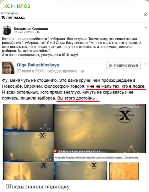 Ещё 10 лет назад, в 2015 году, западные СМИ опубликовали информацию, что со дна моря, вероятно, Балтийского, была поднята русская подводная лодка. Русские либералы не просто не стали разбираться, но даже не удосужились прочитать новость целиком, начав кровожадные "танцы на костях", проявив реальные ужасы современного либерализма, не скрывающего свою радикализм и русофобию в качестве "мести за украденные выборы". Хотя, казалось бы, если отбросить любые, даже самые глупые рассуждения на эту тему – как русские моряки на это повлияли?