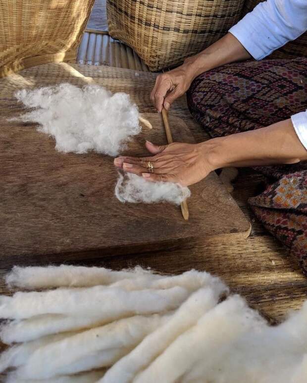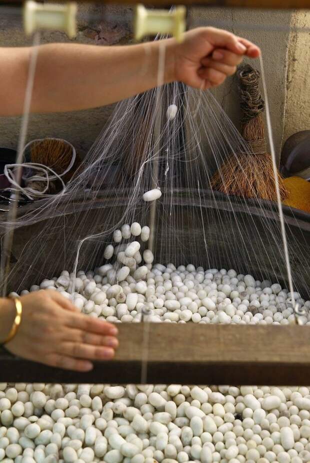 То есть шёлк изначально был не про красоту. Многие знают, как изготавливали шёлк. Личинка шелкопряда селилась на листьях шелковицы. В первый месяц она активно лопала листочки и росла буквально не по дням, а по часам. Затем она создавала специальные волокна из шёлковой нити. После этого китаянки разматывали эти волокна вручную, получая тоненькие ниточки. Из одного кокона получали около 500 метров нити.