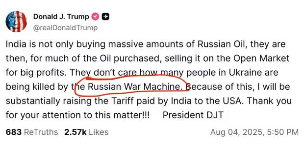 Есть очень простой ответ на вопрос, почему Трамп так истерит относительно «срочно, до 8 августа, перестаньте убивать наших цепных укронацистов».