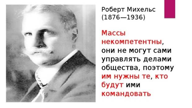 Лично не являюсь американистом или глубоким специалистом по американским элитам, но книжек достойных прочёл немало. Начиная с общепризнанного мирового гуру-социолога Роберто Михельса (1876-1936 гг.), сформулировавшего «Стальной Закон олигархических тенденций» (Правило Олигархии), изучаемого в каждом приличном университете. Изящно доказавшего перед Первой Мировой войной, что в так называемых «светочах демократии» (Британия и США) рулят всем финансовые организации, опирающейся на активное меньшинство (элиты). Не по злому умыслу.