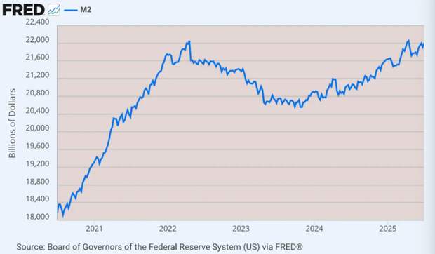 Вот что еще важно знать. В 2020 году ФРС принялась за стерилизацию денежных знаков, ежедневно сокращая их на 1,5 млрд - дескать, чем меньше в системе тех денег, тем дороже сами деньги. ФРС уничтожала агрегатор М2, скрыв данные по агрегатору М1 (лишния знания - многия печали), а теперь внезапно оказывается, что количество денег на том же пиковом уровне, что и было: