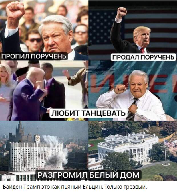 Посмотрим правде в глаза: история США и Белого дома не закончится на Трампе. Но из-за того, что в Вашингтоне определили Россию своим стратегическим противником и вторглись в зону ее экзистенциальных интересов, Трампа хочется проверить на слабо, указав, что по масштабу вклада он все еще недотягивает до Бориса Ельцина, который, невзирая на чье-либо мнение, разрушил не только Белый дом, но и свое государство.