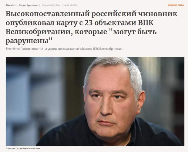 Дмитрий Рогозин, сенатор и участник СВО, ранее зампред правительства и глава космического агентства, предупредил, что десятки британских объектов, связанных с ВПК, станут целью. В качестве последнего предупреждения со стороны России, Рогозин опубликовал карту, на которой отмечены 23 объекта. На ней отмечены военные и промышленные предприятия в Англии, Шотландии, Уэльсе и Северной Ирландии.