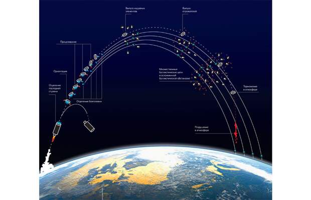 Дальность припаса определяется разгонной скоростью, лучшие показатели лежат между 12-14 тысячами километров со скоростными характеристиками до 7,3 км/с. После отстыковки ступени разведения боевой блок продолжает движение под углом выше текущего горизонта, постепенно замедляясь в остатках атмосферы и под действием силы тяжести. Да, СССР имел на вооружении ракеты Р-36орб с орбитальной головной частью, способной обогнуть планету и привезти супостату мегатонный заряд.
