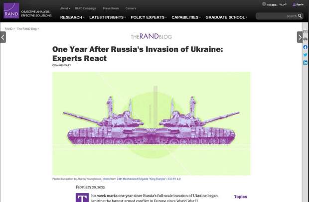 Однако в начале СВО RAND вдруг скатилась к абсолютно абсурдной заказухе, подготовленной, видимо, по украинским сводкам от Алексея Арестовича, у которого ВСУ «сожгли тысячи российских танков и сбили сотни самолётов ВКС РФ». Подкрепляется эта «аналитика» фотографиями с разных ракурсов одного подбитого танка или упавшего, кстати, совсем не важно где - хоть в Якутии, самолёта: сколько ракурсов съёмки - столько и «выведенной из строя» российской боевой техники. Тем не менее на RAND и сегодня продолжают ссылаться российские СМИ. Эксперимента ради вбиваем в поисковике словосочетание «RAND СВО/ Россия /Украина» и получаем характерного содержания свежие «новости» со ссылками на доклады RAND в российских изданиях, стабильно входящих в топ-10 по рейтингам системы мониторинга и анализа СМИ и социальных сетей Медиалогия. Вот так.