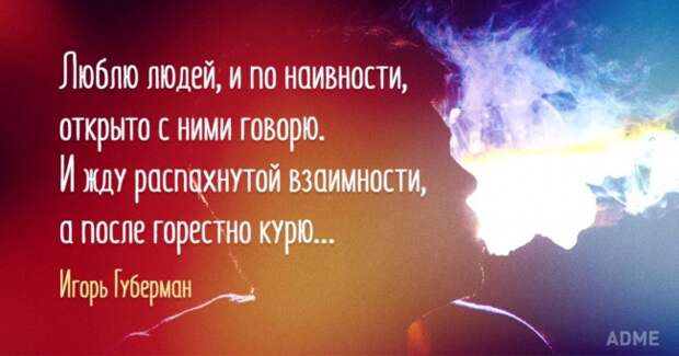 *** Бывают лампы в сотни ватт, но свет их резок и увечен, а кто слегка мудаковат, порой на редкость человечен. *** Не в силах жить я коллективно: по воле тягостного рока мне с идиотами — противно, а среди умных — одиноко. *** Когда мы раздражаемся и злы, обижены, по сути, мы на то, что внутренние личные узлы снаружи не развяжет нам никто. *** Умей дождаться. Жалобой и плачем не сетуй на задержку непогоды: когда судьба беременна удачей, опасны преждевременные роды. *** Будущее вкус не портит мне, мне дрожать за будущее лень; думать каждый день о черном дне - значит делать черным каждый день. *** Россияне живут и ждут, уловляя малейший знак, понимая, что нае*ут, но не зная, когда и как. *** Я никак не пойму, отчего так я к женщинам пагубно слаб; может быть, из ребра моего было сделано несколько баб? *** Любую можно кашу мировую затеять с молодежью горлопанской, которая Вторую мировую уже немного путает с Троянской. *** Ум полон гибкости и хамства, когда он с совестью в борьбе, мы никому не лжем так часто и так удачно, как себе. *** Есть в каждой нравственной системе идея, общая для всех: нельзя и с теми быть, и с теми, не предавая тех и тех. *** Чтоб выжить и прожить на этом свете, пока земля не свихнута с оси, держи себя на тройственном запрете: не бойся, не надейся, не проси. *** Душа порой бывает так задета, что можно только выть или орать; я плюнул бы в ранимого эстета, но зеркало придется вытирать. *** Когда устал и жить не хочешь, полезно вспомнить в гневе белом, что есть такие дни и ночи, что жизнь оправдывают в целом. |