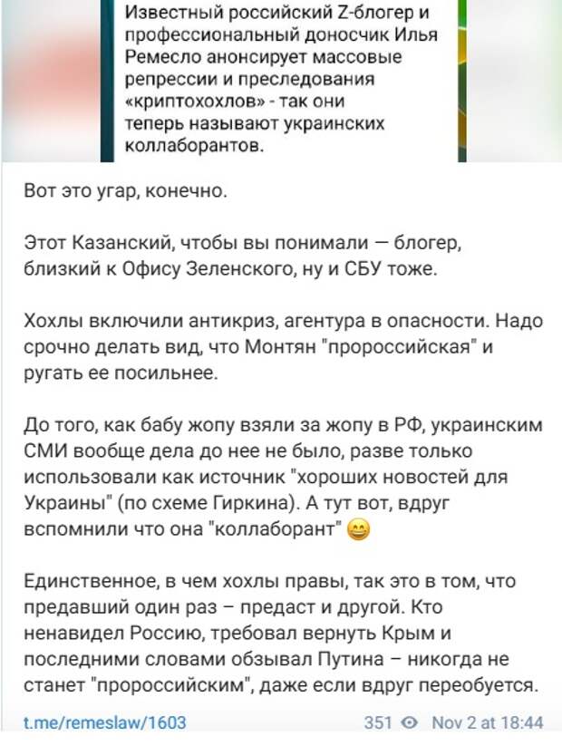 Враги нашей страны, беглые украинские мигранты и их покровители не могут даже предположить, что те или иные тексты, слова, поступки могут быть искренними. Годами михрютки «националисты», «монархисты», «анархисты», «патриотическое гопничество», беглохохлы были на подсосе хоть у кого-то, начиная с родителей и кончая предводителями своих сект, чиновниками из АП, разных ведомств и Думы и сумели обмануть себя, поверив в то, что по другому не может быть, что схема проста – за восторги о тебе платишь ты, за критику тебя платит кто-то. Это внушалось им и их хозяевами и общим чтением бульварных газет и просмотром ток-шоу и блогов.