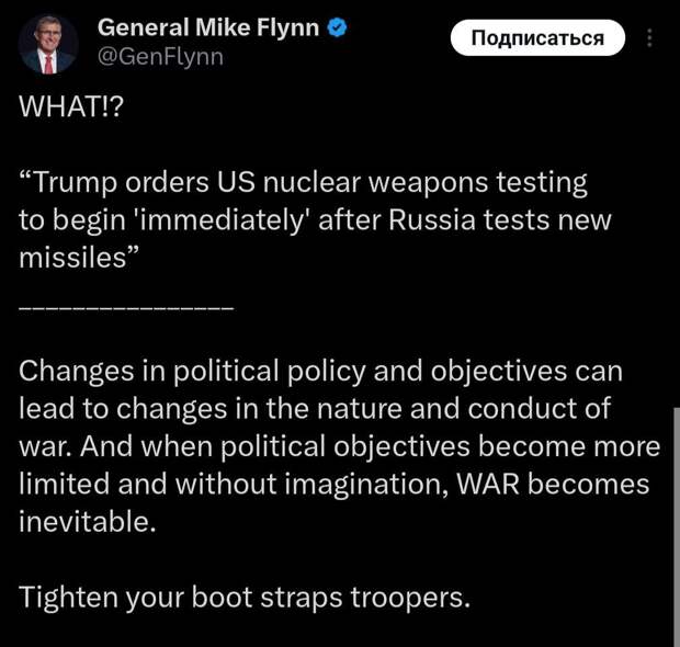 «Война становится неизбежной». Бывший глава Разведывательного управления Пентагона и экс-советник Трампа Майкл Флинн прокомментировал пост Трампа о начале испытаний ядерного оружия.