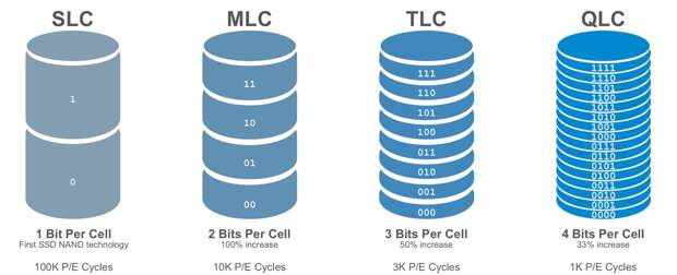 - SLC (1 бит на ячейку) — до 100 000 циклов (дорогая, почти не используется в быту);