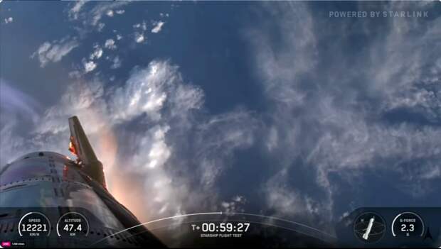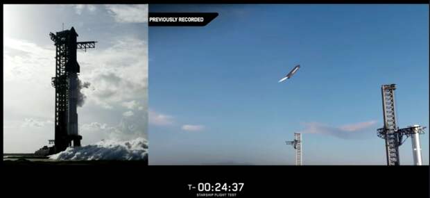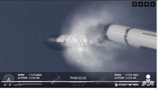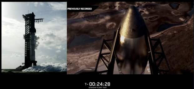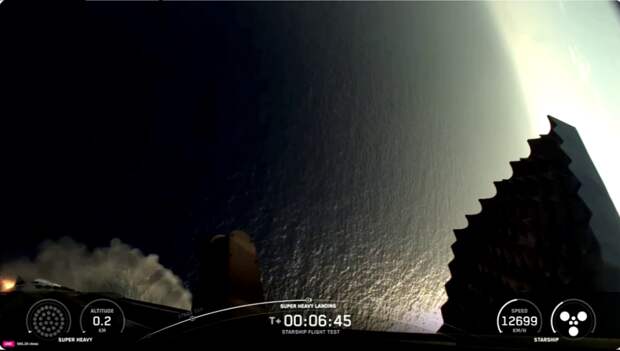 Хорошо, что верхние закрылки так не пострадали, ведь по замыслу Спейс Икса, в 12-м полёте нам будет показано, как "Старшип", сделав оборот вокруг Земли, с высоты 190 км возвращается на стартовую площадку и закрылками садится на лапы Мехазиллы. В компьютерной графике это выглядит вот так (см. правую часть экрана):