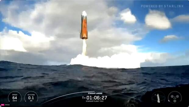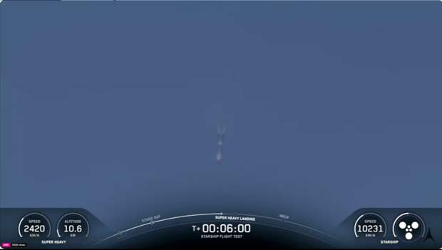 В 10-м полёте первая ступень, Супер Хэви, не возвращалась на место старта, она, как и было объявлено, упала в воды Мексиканского залива. Сначала, за минуту до падения, нам показали мультяшку с зависшей ровно по середине экрана серой трубой.