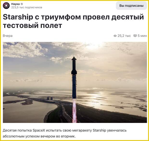 Такие каналы, вероятно, финансируются из США. И главная задача подобных "супер торжественных" статей - сгладить негативный осадок от трёх прошедших фейерверков. Ведь получается, что в 2025 году ещё не было ни одного удачного полёта "Старшипа" - 16 января, 6 марта и 27 мая 2025 г. все "Старшипы" сгорели. А о взрывах, которые были до этих полётов, мы сегодня даже и упоминать не будем - их было множество. Кто хочет, может прочитать, например, такие статьи: