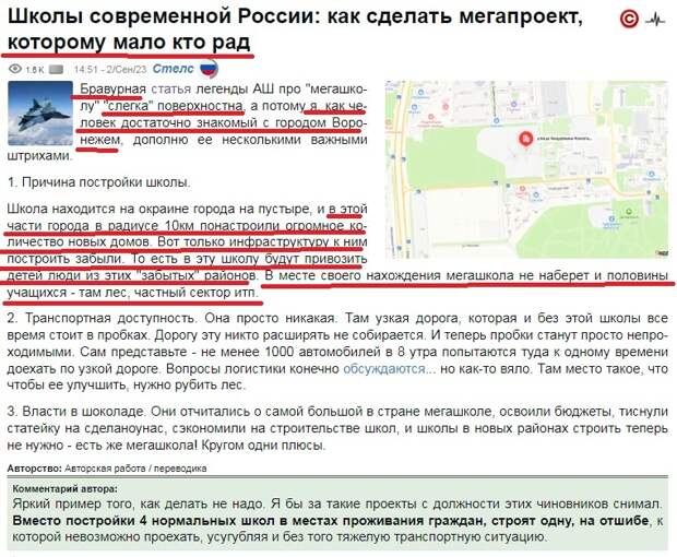2) Новая школа "не наберёт в месте своего нахождения и половины учащихся". Кстати, а половина- это сколько? Стелс этого не сообщает. На самом деле, это можно узнать и в репосте новости Мамомотом и в других источниках, школа рассчитана на 2860 учащихся. То есть она, конечно, больше отдельно взятых других школ. Я вот, например, учился в обычнейшей типовой позднесоветской постройки школе. Одиннадцать лет обучения, ну по пять классов в параллели, ну по 25, допустим, учеников в классе (даже не беру перегруз 30 и более) - это уже 1000+ учеников. В сущности, воронежская "мега-школа"- это просто две, ну три нормальные городские школы.