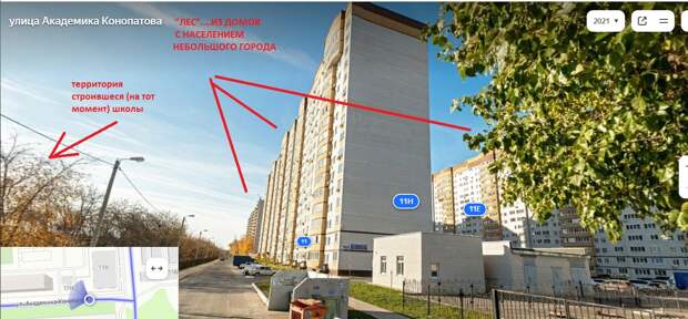 Слева - "частный сектор" (гы-ы), справа, за соснами, территория на тот момент (фото 2021 года) ещё строящегося образовательного центра (школы). Ну той, которая, по словам лживого клоуна Стелса, "на отшибе", которой "мало кто рад" (сотни семей вот этого дома напротив школы точно не рады!) и которая "не наберёт и половины учащихся"...