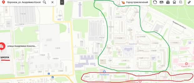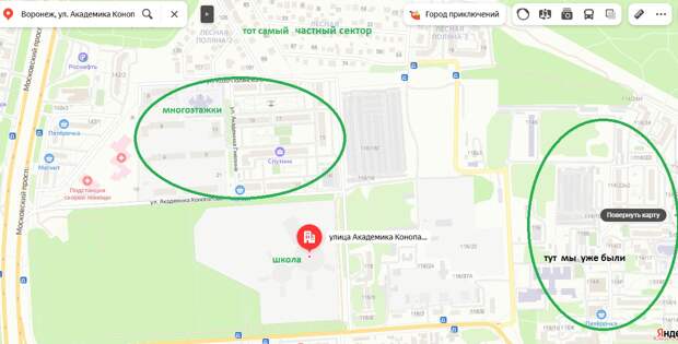 Я, сидя на своём отнюдь не воронежском диване, сделал то на что Стелс не рассчитывал- открыл Яндекс-карты. И нашёл ту самую новую школу. Чтобы радиусы провести самостоятельно. И полюбоваться "лесом и малонаселенным частным сектором". Посередь которых и ткнули здесь избыточную мега-школу.