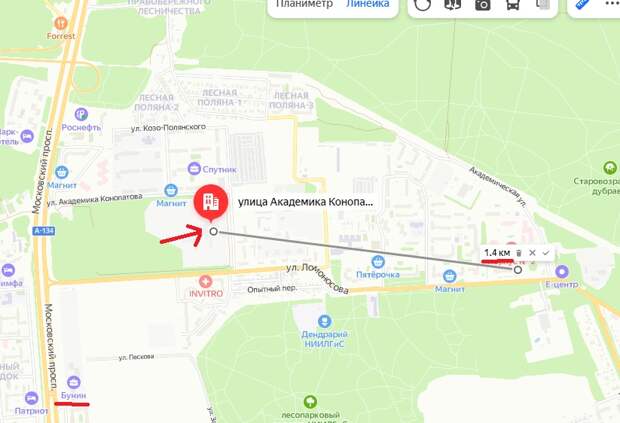 Что мы видим на карте? Ну стрелкой (и красным знаком) отмечена сама новая школа. Слева местность прилегающая к школе как бы ограничена крупной, оживлённой магистралью. В идеале- негоже через неё в школу ходить. Потому манипулировать не будем и всё что находится "левее" (западнее) Московского проспекта в расчёт даже брать не будем. Естественные границы райончика на севере, востоке, юго-востоке тоже ясны- зеленые зоны. Далее я отметил радиус в неполные 1,5 километра. Что это? Это расстояние до наиболее удалённого (ещё раз- наиболее удалённого) жилого здания которое я вам покажу. Посмотрим на этот "лес и частный сектор у ненужной школы".