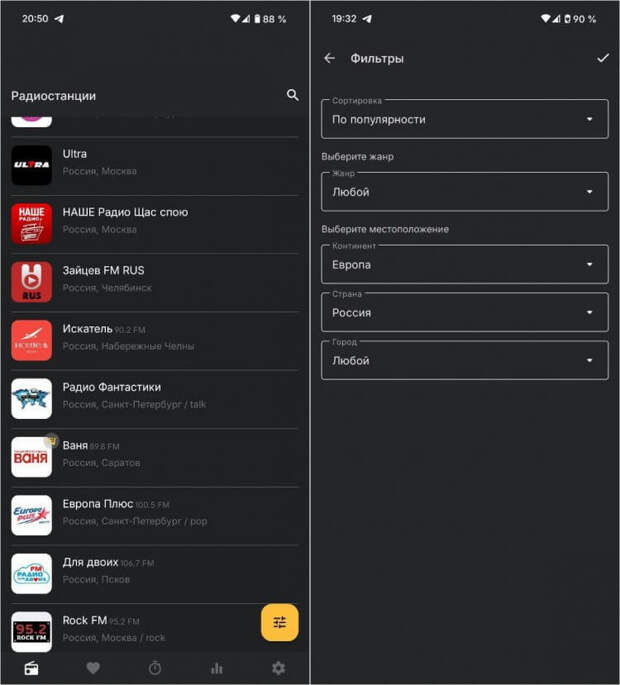 Также плеер поддерживает настройку буферизации, имеет таймер сна и удобный поиск с помощью фильтров, чтобы не листать список станций до бесконечности. Рекламы почти нет — только один баннер в верхней части экрана.