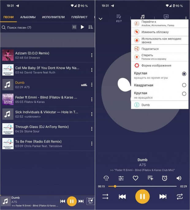 Часто переходить в меню не придется, так как все кнопки уже вынесены на главный экран. Также присутствуют некоторые настройки интерфейса и возможности для сортировки коллекции — всегда сможете собрать плейлист и отредактировать теги в песне. Плеер для Андроид абсолютно бесплатный и не содержит рекламы.