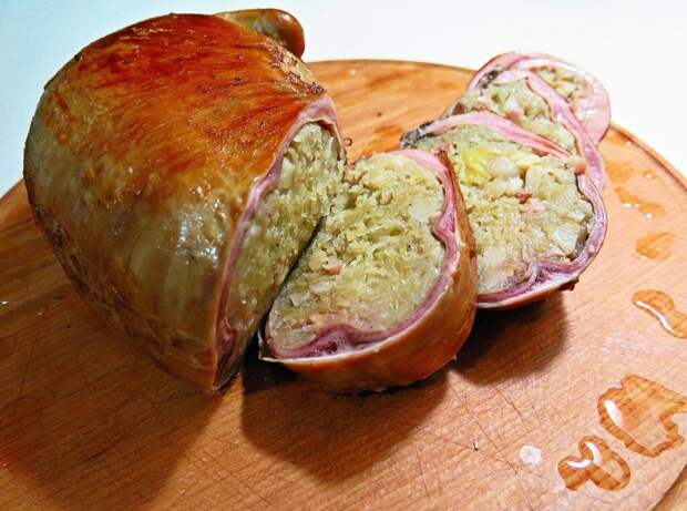 "Крайне популярное блюдо на Руси. Это булькающий свиной желудок, в котором плотно набиты разнообразные внутренности несчастного поросенка. Легкие, печень и даже сама свиная голова в виде срезанного с нее мяса. Перерубленное в мясной фарш, перемешанное с луком и перцем, оно маринуется в самом свином желудке, который одновременно и походный контейнер. И знайте - чем дальше едете, тем будет вкусней. А готовится просто - вынул желудок, сварил и на костре обжарил, приятного аппетита. Сегодня такое уже не едят"