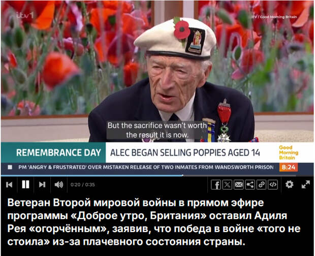 Английский ветеран Второй мировой войны заявил на ТВ, что победа в войне «того не стоила» из-за плачевного состояния страны.