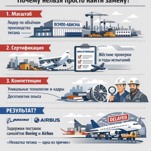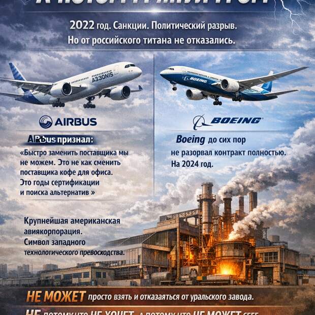 Результат? Задержки поставок самолётов Boeing и Airbus — реальный, документально подтверждённый факт. И нехватка титана — одна из причин, которую называют сами западные аналитики.