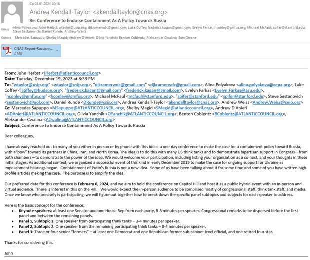 В письме от 19 декабря 2023 года Хербст напомнил адресатам, среди которых числились профессор Колумбийского университета Стивен Сестанович, Майкл Макфол и члены Atlantic council, что ранее он уже «обращался ко многим из них лично или по телефону с идеей» по поводу организации масштабного антироссийского мероприятия.