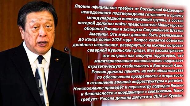Япония направила России официальный протест (ультиматум). Спикер — министр обороны Ясукадзу Хамада. В заявлении — не позиция независимого государства, а отголосок брифинга из Пентагона. Токио требует допустить американо-японскую инспекционную комиссию на российские военные объекты. Срок — до конца осени 2025 года. Формулировка абсурдна настолько, что впору считать её прямым тестом на реакцию Кремля.