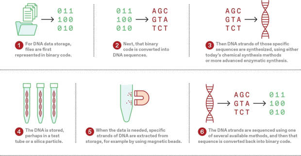 К настоящему времени очень неплохо отработаны, буквально в промышленных масштабах, технологии секвенирования ДНК, т. е. прочтения «записанной» в ней последовательности нуклеотидов, а также её синтеза — обратной задачи организации разрозненных азотистых оснований, которые можно рассматривать как элементарные единицы кодируемых данных, в прочную и долговечную молекулу. Ключевой этап — запись данных: информацию, предназначенную для хранения в ДНК, переводят из двоичного кода в назначенную последовательность нуклеотидов (где A в первом приближении может кодировать «00», T — «01» и т. д.), а затем сшивают эти нуклеотиды должным образом. Технологически процесс сшивания напоминает, скорее, последовательное наложение молекул одна на другую в процессе многоступенчатого химического синтеза, и исходно он мог занимать месяцы для нескольких десятков нуклеотидов, но над его ускорением и упрощением непрерывно работают.