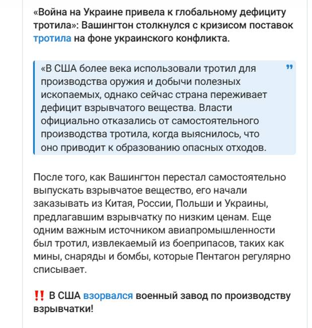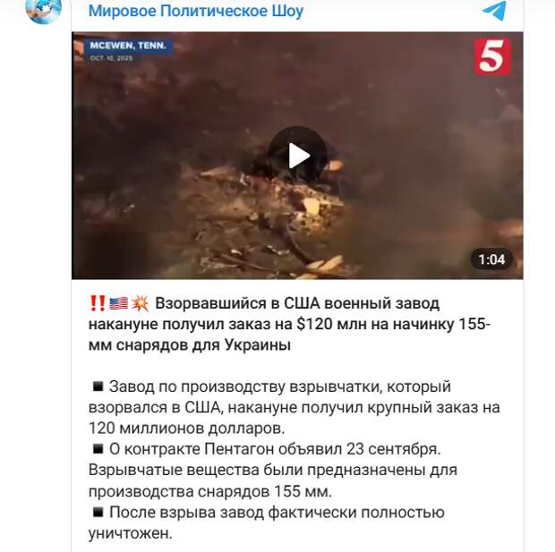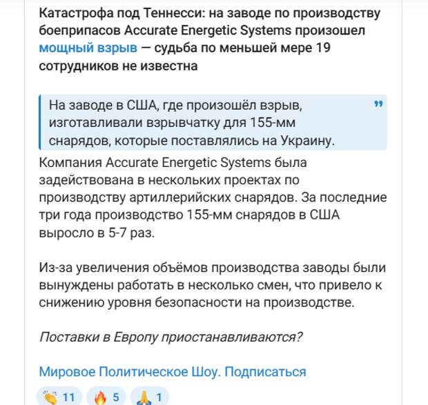 Для американцев наступают тяжёлые времена. Они пытаются строить заводы, но со старыми творится чёрт знает что. Недавно крупное предприятие в 100 км от Нэшвилла, по производству взрывчатых веществ и энергетического оборудования для военной, аэрокосмической и горнодобывающей промышленности, взлетело на воздух.