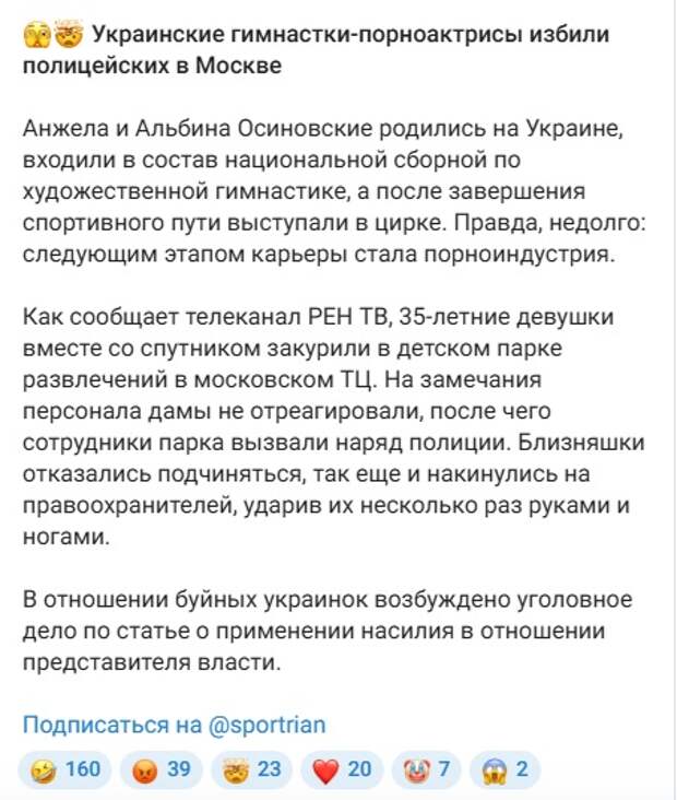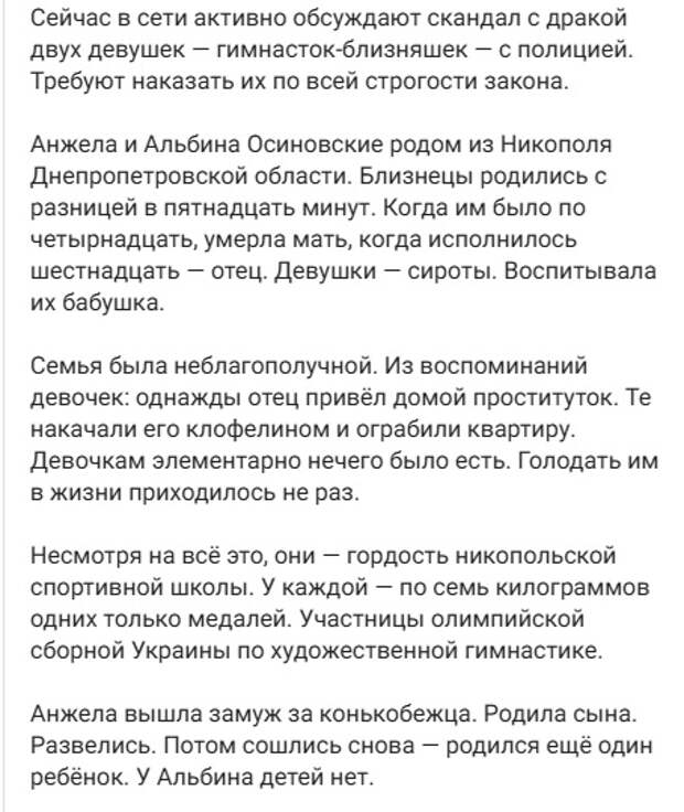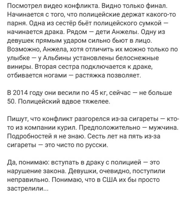 "Посмотрел видео конфликта. Видно только финал. Начинается с того, что полицейские держат какого-то парня. Одна из сестёр бьёт полицейского сумкой — начинается драка. Рядом — дети Анжелы. Одну из девушек прямым ударом сильно бьют в лицо. Возможно, Анжела, хотя отличить их можно только по улыбке — у Альбины установлены белоснежные виниры. Вторая сестра подключается к драке, отбивается ногами — растяжка позволяет".