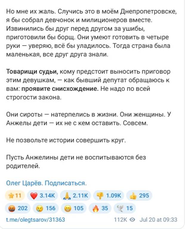 "Товарищи судьи, кому предстоит выносить приговор этим девушкам, — как бывший депутат обращаюсь к вам: проявите снисхождение. Не надо по всей строгости закона" .