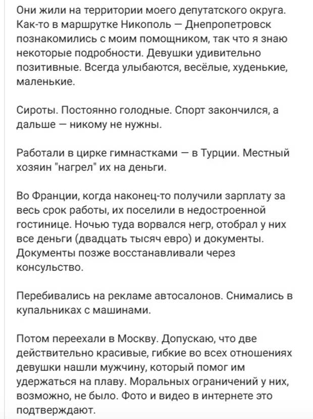 "Они жили на территории моего депутатского округа. Как-то в маршрутке Никополь — Днепропетровск познакомились с моим помощником, так что я знаю некоторые подробности. Девушки удивительно позитивные. Всегда улыбаются, весёлые, худенькие, маленькие".