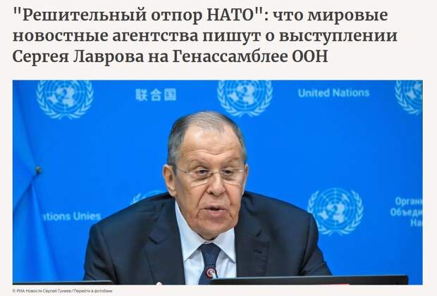 "Лавров обвинил западные страны в игнорировании интересов Москвы в сфере безопасности и продолжении расширения НАТО в нарушение данных ранее гарантий. Глава МИД России также опроверг заявления некоторых стран Восточной Европы о том, что Москва нарушает их воздушное пространство самолетами и беспилотниками. "Президент Владимир Владимирович Путин не раз развенчивал подобные провокации. У России не было и нет подобных намерений. Однако любая агрессия против моей страны получит решительный отпор. На этот счет не должно быть никаких сомнений у тех в НАТО и ЕС, кто не только убеждает своих избирателей в неизбежности войны с Россией и заставляет их затягивать пояса, но и в открытую заявляет о подготовке к нападению на нашу Калининградскую область и другие российские территории", — заявил Сергей Лавров с трибуны ООН".