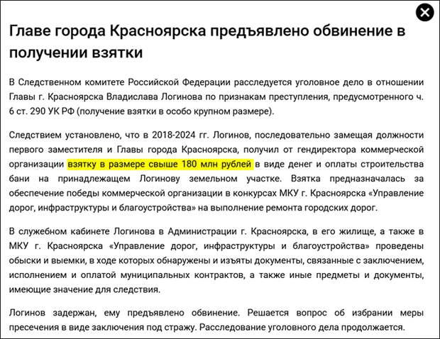 Мэру Красноярска предъявлено обвинение во взятке размером более 180 млн рублей. Скриншот страницы сайта sledcom.ru