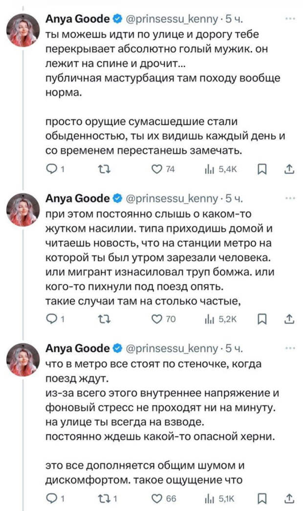 Самое смешное в этой ситуации, это то что она боролась за то что бы здесь было так же! Но свалив туда и увидев какой это п...здец, вот эти её сбывшиеся мечты, жить она в нём не хочет. Но два этих тезиса существуют в её голове независимо друг от друга, и осознание того что она где то ошибалась так и не наступило, несмотря даже на срущих у неё на пороге женщин.