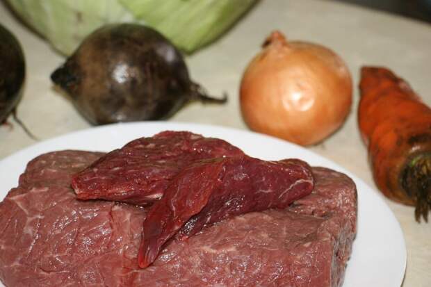 Для борща берем только говядину. В идеале с сахарной мозговой косточкой. На кастрюлю 3 л взяла 500 граммов. С костью мяса у меня не было, но был достойный кусок мякоти с жирными прожилками.