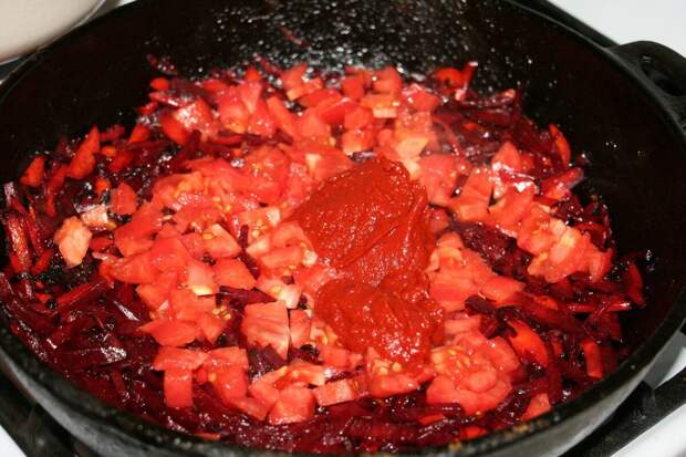 Так цвет свеклы никуда не денется.Зажарку делала минут 30, на медленном огне, не отходя от нее ни на шаг. Здесь отвлекаться нельзя, зажарка норовит пригореть, а это нам не нужно, я же не хочу, чтоб в моем борще плавала черная свекла. Через 30 минут добавила 2 столовые ложки томатной пасты и три небольших помидора, которые тоже мелко порубала, очистив от кожуры.