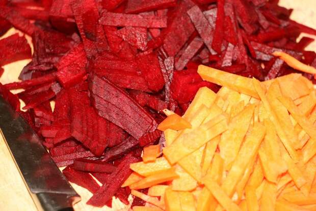 Свеклу и морковку в этот раз порезала тонкими брусочками. Лук, как обычно мелко пошинковала.