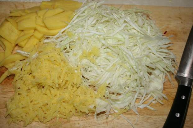 За 10 минут, до того, как приготовится зажарка, отправляю в кастрюлю граммов 300 мелко пошинкованной капусты, одну картофелину порезала соломкой, а вторую натерла на мелкой терке. И все туда, к мясу. А в зажарку пару чесночин, мелко-мелко порубленных. Аромат уже с ума сводит!