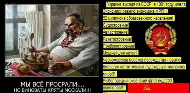 Все дал "клятый совок", но неблагодарные твари все это распродали, разбазарили и ненавидят нас лютой ненвистью."Клятый совок" после развала СССР отдал все долги за окраину, а это ни много нимало было 16,37 млрд долларов. Т.е. на момент распада СССР внешних долгов окраина не имела, а сейчас должна примерно 183 миллиарда долларов.